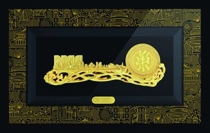 擺件以抽象鑰匙為形象,寓意開啟2014年青島世園會(huì)。產(chǎn)品以青島典型歐陸風(fēng)情的“萬(wàn)國(guó)建筑”和代表著青島的特色海岸線襯托會(huì)徽LOGO,寓意太陽(yáng)初升浮山灣海韻的曙光,其精髓意在“上善若水”的品德。精致的浮雕工藝,細(xì)膩的線條,再加上鑲嵌的72顆施華洛水鉆和24K純金電鍍,使產(chǎn)品顯得高檔、華麗。