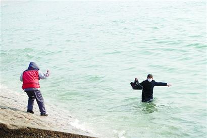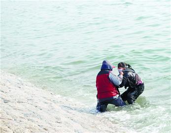 昨天下午1時(shí)左右,五四廣場(chǎng)海邊上演了驚險(xiǎn)一幕,一名女子突然輕生跳海,正在一邊拉生意的攝影師付守庫來不及脫下身上厚厚的棉衣,直接跳到冰冷刺骨的海水里,將輕生女子托出水面,又在眾人的幫助下,將這名女子弄到了岸上。幸虧搶救及時(shí),輕生女子并沒有生命危險(xiǎn),該女子被隨后趕到的民警帶走。記者了解到,這不是付守庫第一次救人,在五四廣場(chǎng)工作3年的時(shí)間里,已經(jīng)救人4次。