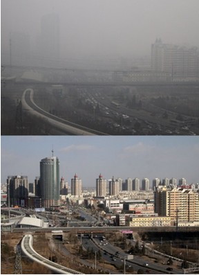 ????1月28日,北京霧霾黃色預警持續(xù)。這張拼版照片顯示的是:2013年1月28日拍攝的天通苑社區(qū)和標志建筑北方明珠被霧霾籠罩(上圖);2013年1月24日,天氣晴好下的天通苑社區(qū)和標志建筑北方明珠(下圖)。