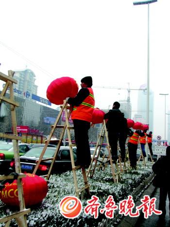 為了迎接春節(jié),工人們在雪中安裝大紅燈籠。本報記者程凌潤攝