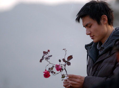 小利的男友在墳頭插上一束月季花,眼中噙滿淚水