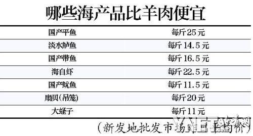 ????記者調查發(fā)現(xiàn),不但羊肉價格已經和三文魚基本持平,農貿市場中的大多數(shù)海鮮價格都低于羊肉價格。例如國產的魷魚只有11.5元/斤,而扇貝也僅僅20元/斤。