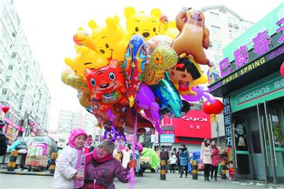 ????春節(jié)過后,孩子們喜歡的“喜羊羊”“小熊維尼”“海綿寶寶”等卡通圖案的氫氣球在街頭隨處可見。昨天上午,記者來到臺東步行街,看到幾個商販?zhǔn)掷锬弥鞣N圖案的氫氣球大聲地吆喝著,市民陳女士帶著3歲大的孫女彤彤來到商販跟前,彤彤看到花花綠綠的氣球非常喜歡,非要買一只 “喜羊羊”圖案的氫氣球,陳女士立刻掏出5元錢,給彤彤買了一個。