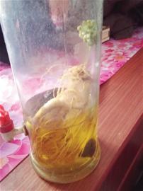 “這棵人參是親戚從東北帶來送給我的,我拿它來泡酒喝。 ”高先生說,這棵人參已經(jīng)在瓶子里面泡了兩年多的時(shí)間,泡參所用的是52°的白酒?!捌綍r(shí)這酒一直儲(chǔ)藏著不動(dòng),只有過年的時(shí)候才拿出來喝,今年春節(jié)我拿出來喝,一看,泡在酒里面的人參竟然發(fā)芽開花了!真的很奇怪?!备呦壬d奮地說。