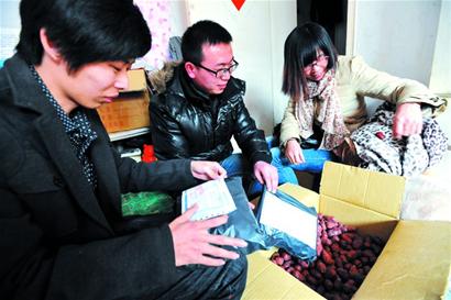 ????從前天開始,連續(xù)兩天,王金鳳的寧夏老鄉(xiāng)們通過記者聯(lián)系上了王金鳳,他們利用周末的時間來到王金鳳家?guī)兔Α!拔业募依锖軄y,照看小海還要賣棗,平時沒時間打掃屋子,老鄉(xiāng)們一來,我終于有時間收拾屋子了?!弊蛱熘形?,記者再次來到王金鳳家,不到10平方米的小家已經(jīng)整齊多了。王金鳳的3名老鄉(xiāng)正在擦拭著新疆紅棗,幫她稱重裝袋,然后按照網(wǎng)店購物的地址發(fā)送快件。從早上9點(diǎn)忙到下午2點(diǎn),3名老鄉(xiāng)終于幫王金鳳搞定了網(wǎng)店訂購的紅棗,并發(fā)出了第一批快件。