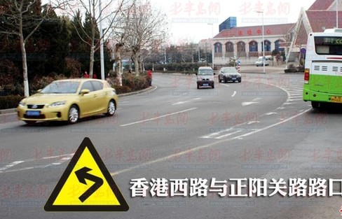 ????“前面路口有個(gè)急彎,開(kāi)車可得慢點(diǎn)?!?5日,根據(jù)袁師傅提到的幾處危險(xiǎn)路段,記者乘車來(lái)到其中之一的香港西路與正陽(yáng)關(guān)路路口,在沿香港西路自東向西行駛到該路口時(shí),右拐彎度極大的路口十分考驗(yàn)司機(jī)的駕駛技術(shù)。