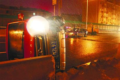 記者在現(xiàn)場采訪時,發(fā)現(xiàn)離事發(fā)地不足10米處,還有一輛長城車側(cè)翻在快速路上?!爱?dāng)時這輛越野車發(fā)生事故后,這輛出租車就停在路口看熱鬧,也沒打開雙閃?!蹦繐粽吒嬖V記者,結(jié)果這輛出租車停下不久,后面就駛來一輛長城兩廂轎車,因為雨天視線受阻,再加上路面濕滑,這輛長城轎車在離出租車10米遠的地方才發(fā)現(xiàn)前方停著一輛車,急打方向已經(jīng)來不及,一頭撞在出租車的左后側(cè),失去平衡后,這輛長城轎車發(fā)生了側(cè)翻。