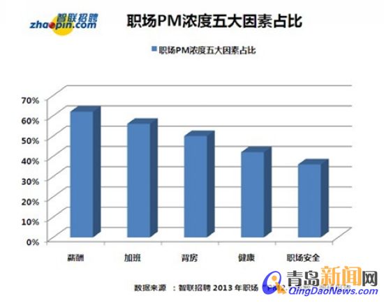 ????業(yè)內(nèi)專家認(rèn)為,職場出現(xiàn)跳槽率走高、活躍度加強(qiáng)等現(xiàn)象,與近年來日趨嚴(yán)重的“職場霧霾”有關(guān)。據(jù)日前智聯(lián)招聘發(fā)布的《2013年職場“PM2.5指數(shù)”調(diào)研》顯示:薪酬、加班、背房、健康和職場安全感成為職場人“最不滿”的五大要素。