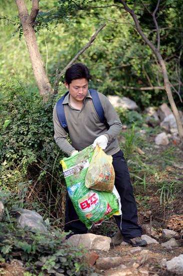 ??? 青島新聞網(wǎng)3月8日訊 工作中,他是西裝革履的銀行客戶經(jīng)理,是黨員示范崗的優(yōu)秀代表;到了周末,他好像變成了另一個(gè)人,戴著太陽(yáng)帽和線手套、背著裝滿編織袋的特制大書包、拿著一米長(zhǎng)的巨型鑷子。九年來(lái),他翻山越嶺、走遍崎嶇山路,用自己的雙腳丈量浮山每一寸土地,用雙手拾遍漫山垃圾。他就是王德洋,青島人更愿意稱呼他“青島環(huán)保哥”。