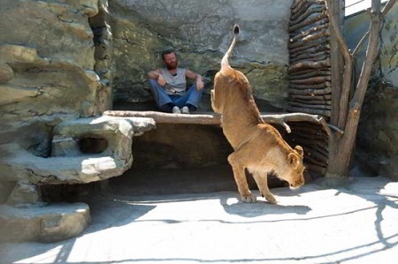 據(jù)報道,這名男子叫做亞歷山大,是烏克蘭一家私人動物園的經(jīng)營者。他曾在2011年挑戰(zhàn)與2只獅子“同居”35天,最終取得成功,毫發(fā)無傷。此次,亞歷山大決定再次挑戰(zhàn)與獅子“同