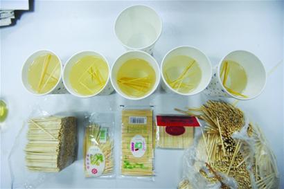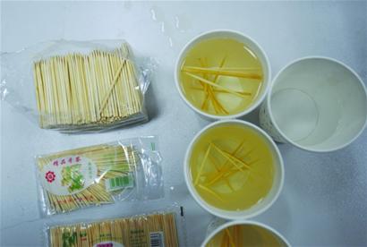 ????將牙簽放進熱水中,1號牙簽立即冒出氣泡,刺鼻氣味明顯。 2號、5號牙簽的氣泡明顯大于3號、4號。半個小時后記者將牙簽取出,1號牙簽上有薄薄一層白色顆粒狀物質(zhì),2號牙簽用指甲一掐就可以掐斷,五種牙簽表面都不再光滑。雖然實驗結(jié)果并不如一次性筷子浸泡后那么具有視覺沖擊力,但記者得到的同樣也是五杯泛黃的“茶水”,尤其浸泡1號牙簽的水最黃。而包裝最規(guī)范的3號牙簽,卻不是水最清的,被4號牙簽取代。記者將一杯清水放在旁邊做對比,浸泡后得到的黃水更加明顯。