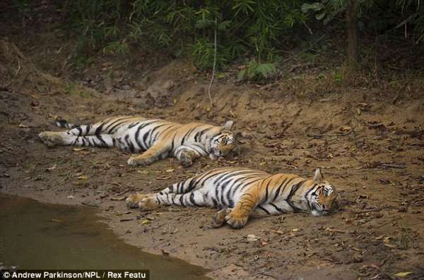 印兩幼虎嬉鬧打斗后休憩 畫面逗趣
