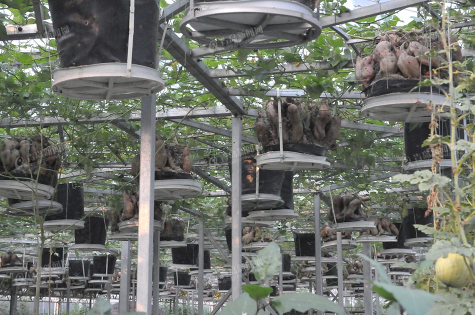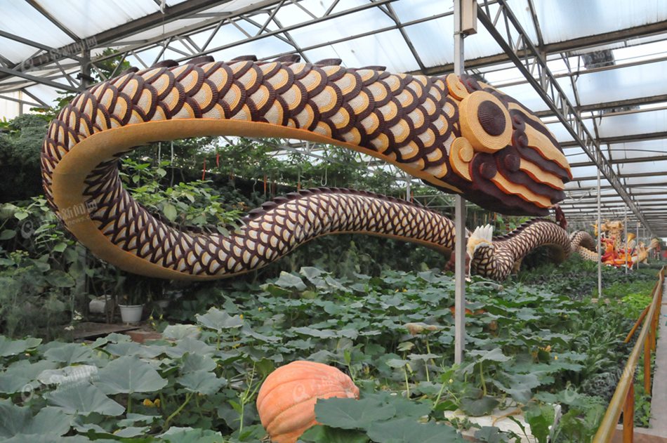????在展廳內(nèi),兩條金黃的“巨龍”氣勢(shì)非凡地?fù)屓胗慰偷难矍?。一顆龍珠落在半空中,龍頭分別扭動(dòng)注目,龍須栩栩如生,龍爪作爭(zhēng)奪狀,身體則朝東西方向蜿蜒盤旋著。周圍,菊花腦、土人參、益母草、鼠尾草等近50種蔬菜、花卉簇?fù)沓删啊?/p>