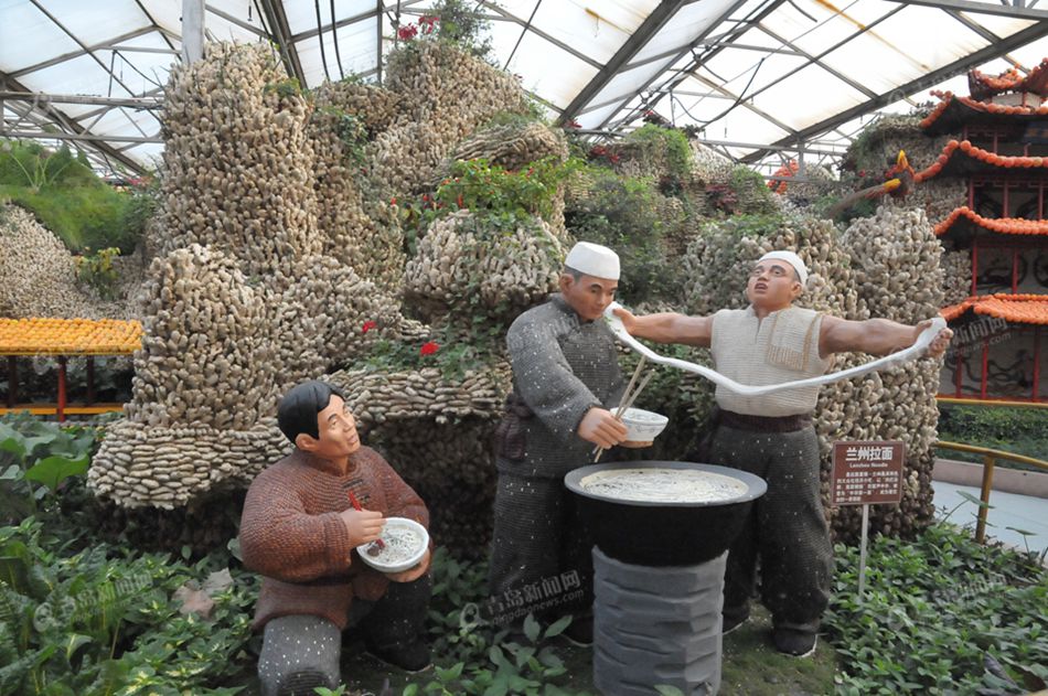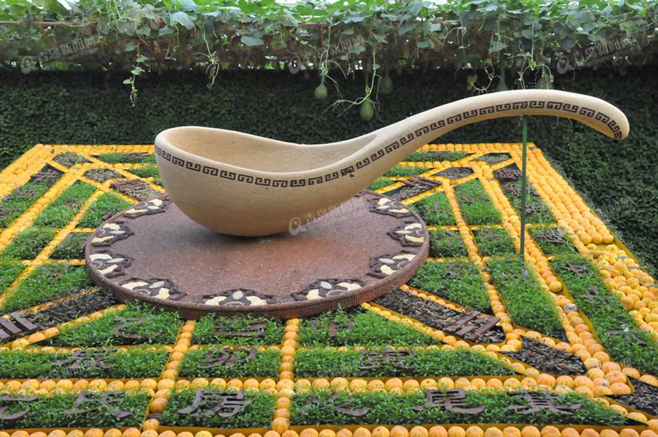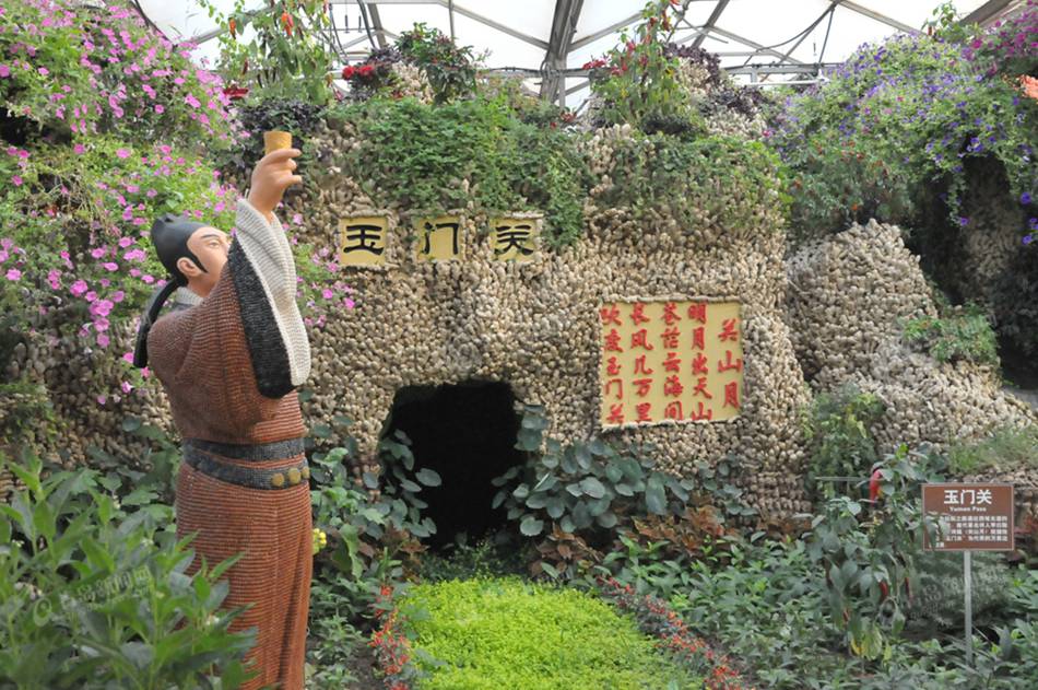 ????一進(jìn)展廳,展現(xiàn)在大家面前的是飛天神韻景觀。該景點(diǎn)以民族藝術(shù)的瑰寶、敦煌藝術(shù)的標(biāo)志“飛天”為造型的兩個(gè)幸福吉祥的使者,迎接五湖四海的賓朋,兩尊氣勢(shì)磅礴的造型,均由紅豆、玉米等各類糧食、蔬菜種子粘貼而成。