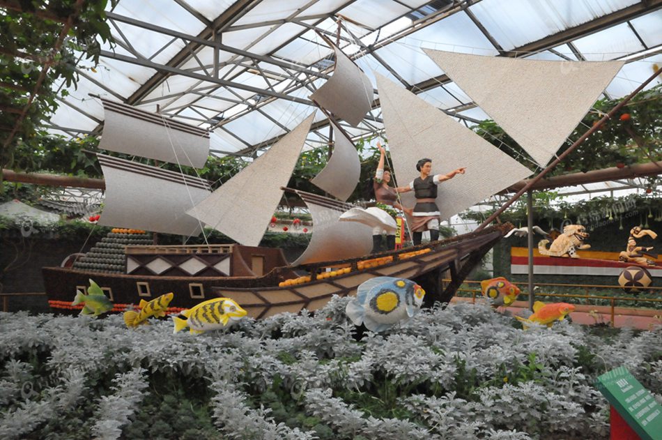 ????西區(qū)的風(fēng)調(diào)雨順景點(diǎn),以“四大天王”與“五谷豐登”為造型元素,寓意風(fēng)調(diào)雨順、五谷豐登、國(guó)泰民安、萬(wàn)事如意;東區(qū)的獅舞慶豐景點(diǎn),寓意吉祥如意,寄托菜鄉(xiāng)人民求吉納福的美好意愿;北區(qū)為圣鄉(xiāng)騰龍景點(diǎn),寓意人壽年豐。這些蔬菜景點(diǎn)均以新鮮蔬果為表現(xiàn)形式,妙趣橫生,讓參觀者切身感受到萬(wàn)千蔬菜流露出的濃濃文化氣息。