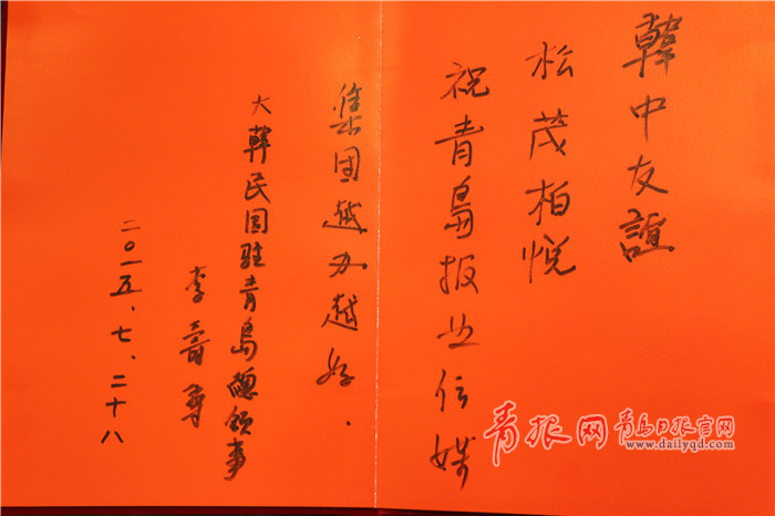 李壽尊一行與與青島日報社黨委書記叢培科,青島日報社社長、青島報業(yè)傳媒集團(tuán)董事長、青島網(wǎng)絡(luò)集團(tuán)董事長蔡曉濱,青島日報社黨委副書記、青島報業(yè)傳媒集團(tuán)總經(jīng)理王海濤,青島日報社黨委副書記、青島日報總編輯余欽偉進(jìn)行了座談交流。座談中,雙方介紹了報社及韓國總領(lǐng)事館的情況,就今后如何充分利用各自的平臺、資源優(yōu)勢,深入開展合作進(jìn)行了友好交談。李壽尊對青島日報社、青島報業(yè)傳媒集團(tuán)走多媒體融合、多元化發(fā)展、多品牌積聚之路表示高度贊賞,并寫下了“韓中友誼松茂柏悅,祝青島報業(yè)傳媒集團(tuán)越辦越好”的中文題詞。隨后,李壽尊一行參觀了集團(tuán)辦公大樓、青島日報編輯部、新媒體演播室等,并接受了青島日報記者的專訪,還作客“全媒體演播室”接受訪談。