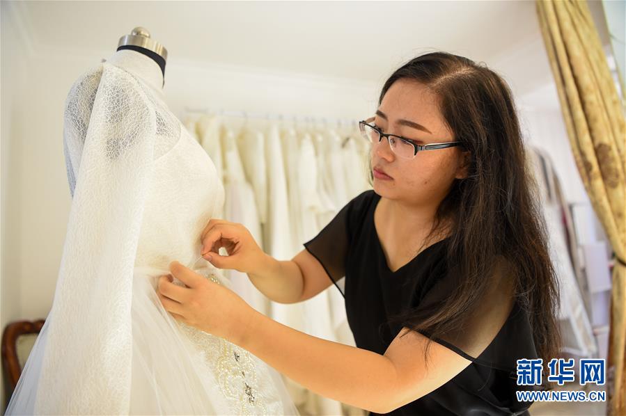 王艷蘭在工作室內(nèi)制作一款融入蒙古族民族元素的婚紗禮服(7月26日攝)。
