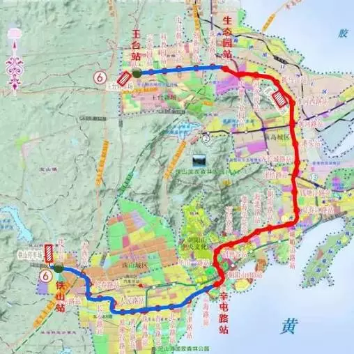 井岡山路—王臺的6號線是一條貫穿黃島區(qū)的L型路線。自太行山路站起沿著團結(jié)路向北,經(jīng)辛安、紅石崖,到達終點王臺鎮(zhèn)站,線路長度29.89km。
