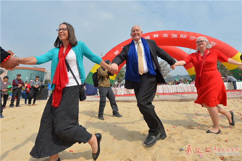 外國(guó)友人在青島“沙灘節(jié)”上與市民手拉手參與互動(dòng)。