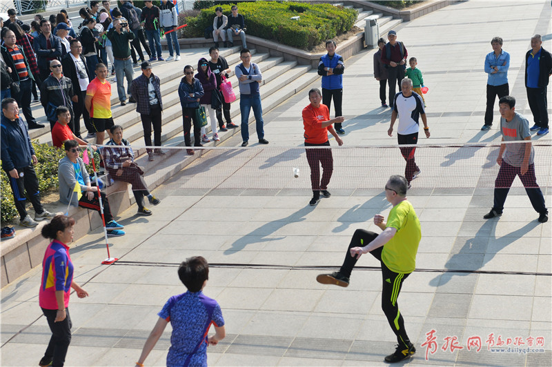市民在第一海水浴場(chǎng)進(jìn)行踢毽比賽。