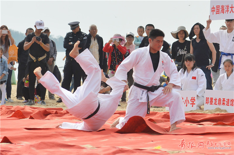 市民在第一海水浴場(chǎng)進(jìn)行柔道表演。