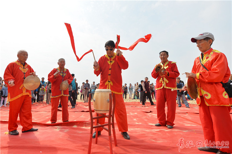 市民在第一海水浴場(chǎng)表演幾近失傳的“鳳點(diǎn)頭”鑼鼓。