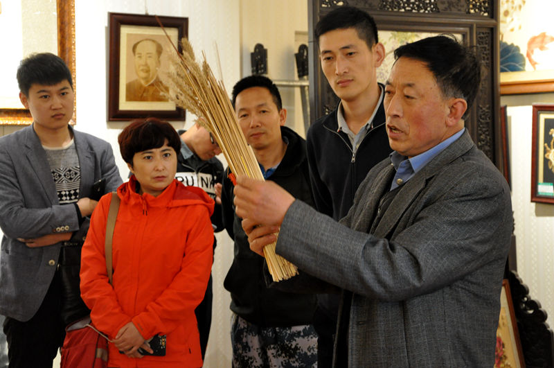 本次采風(fēng)活動(dòng)的第一站聯(lián)盟成員們來到了泊里鎮(zhèn)麥草畫展覽館。麥草畫始于隋唐時(shí)代的宮廷工藝品,是以麥秸稈為造型原料,運(yùn)用麥稈的自然光澤和紋理、質(zhì)地,創(chuàng)造性融入國畫、油畫、水粉畫、版畫、刻版書法等諸多技術(shù)技法,經(jīng)過熏、蒸、漂、刮、推、燙、以及剪、刻、編、繪等多道工序,純手工制作而成。展覽館內(nèi)陳列著各類麥草畫展品?;B畫、偉人像、江山圖等作品栩栩如生,讓聯(lián)盟成員們?nèi)滩蛔≠潎@。