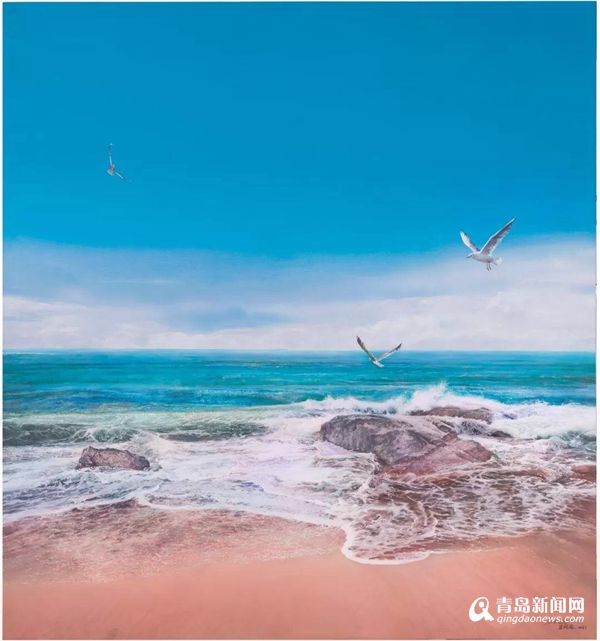 青島市美協(xié)主席王紹波,此次為上合峰會(huì)創(chuàng)作了巨幅作品《碧海長天》。《碧海長天》以布面丙烯為媒介材料,充分運(yùn)用了水彩畫水色通透的技法和表現(xiàn)語言。以藍(lán)天大海為創(chuàng)作主題,通過對海天、激浪等自然風(fēng)貌的描繪,意在表現(xiàn)豁達(dá)通暢、高遠(yuǎn)昂揚(yáng)的意境和情懷,翱翔在天空的海鷗象征著對理想、信念的抒發(fā)和追求。