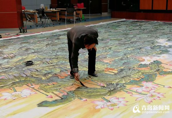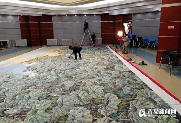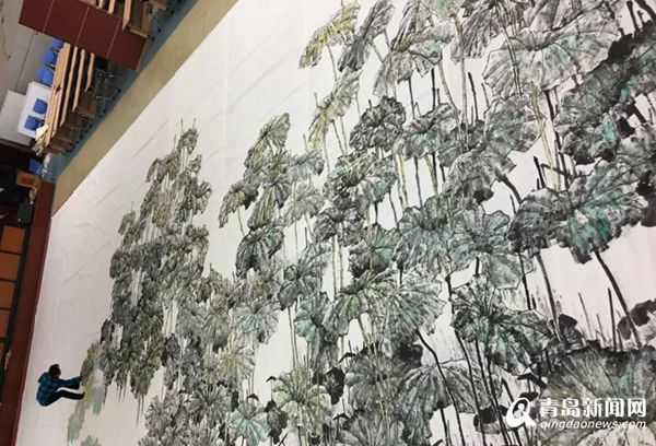 一幅長約17米,寬約7米的巨幅畫作《映日荷花》掛在上合青島峰會(huì)主會(huì)場尚和廳里,顯得格外醒目震撼,一望無際的青碧色荷葉中,粉色荷花點(diǎn)綴其間,紅日映照下的荷葉與荷花呈現(xiàn)出金色的光芒,恰如“接天蓮葉無窮碧,映日荷花別樣紅”的詩境。這幅巨作的作者正是島城畫家梁連生先生。