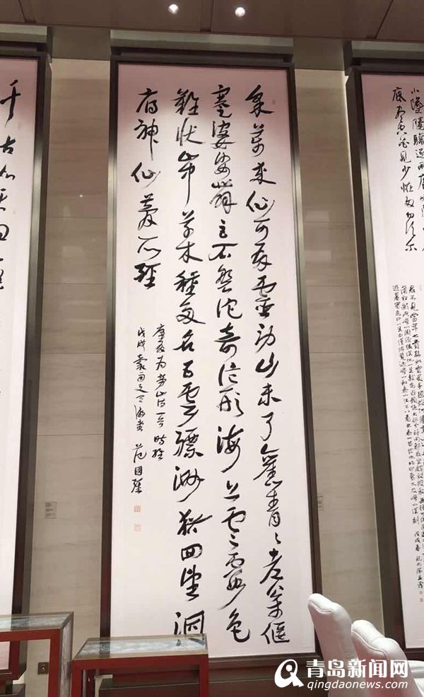 在青島國際會(huì)議中心的大廳里,十幅巨幅書法作品分外引人注目,其中的一幅《游嶗山歸途贈(zèng)徐善伯》便是出自青島市書法協(xié)會(huì)主席范國強(qiáng)之手。作為唯一入選的島城書法家,范國強(qiáng)很快選定了康有為的詩作為創(chuàng)作內(nèi)容??涤袨橥砟暝谇鄭u居住,康有為故居至今仍是青島的熱門景點(diǎn),而形容島城美景最經(jīng)典的一句“紅瓦綠樹、碧海藍(lán)天”便是出自康有為的手筆。青島書法家書寫曾在青島居住過的文化名人贊青島的詩句,可謂是青島元素最淋漓盡致的體現(xiàn)了。