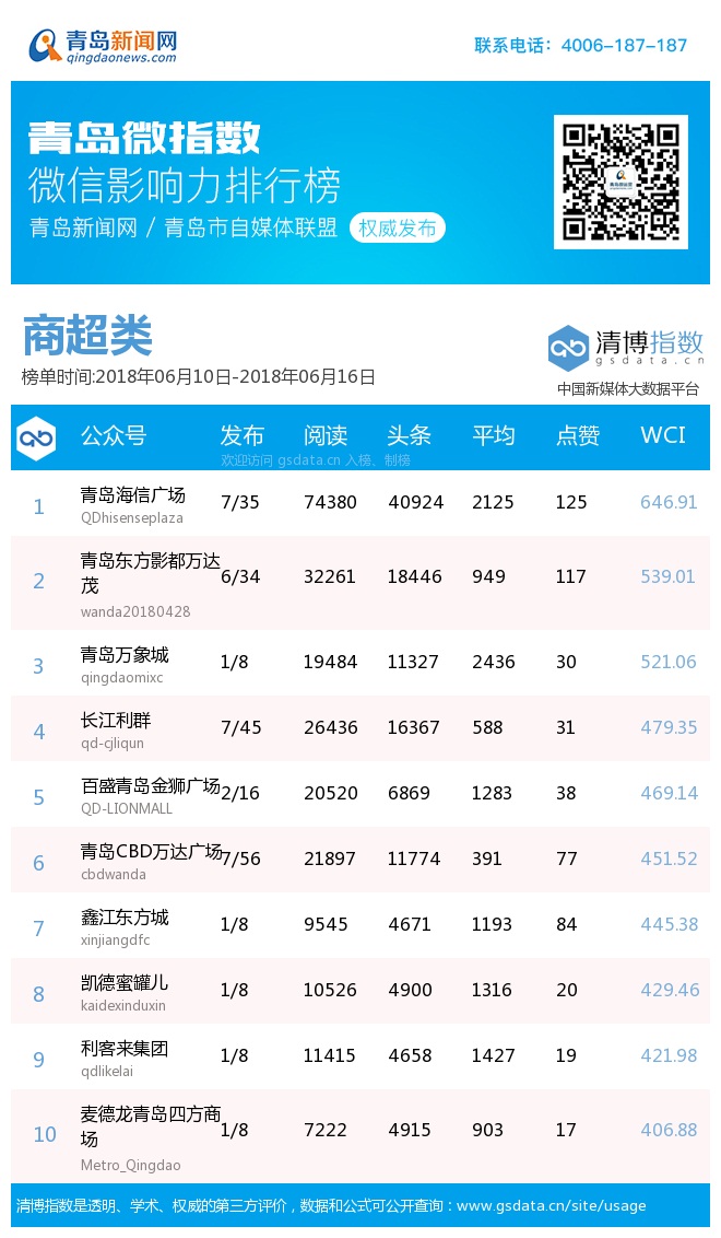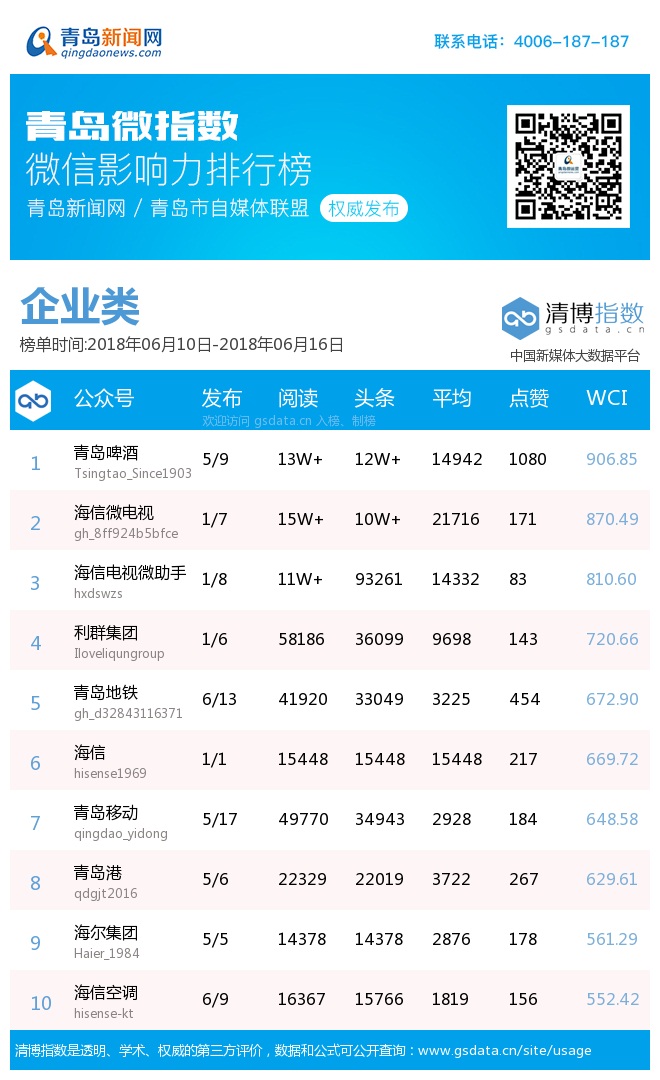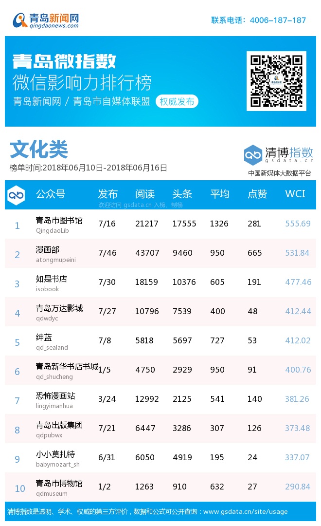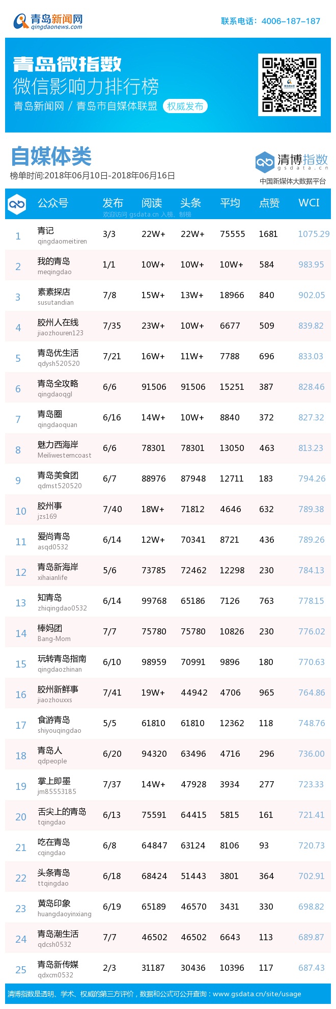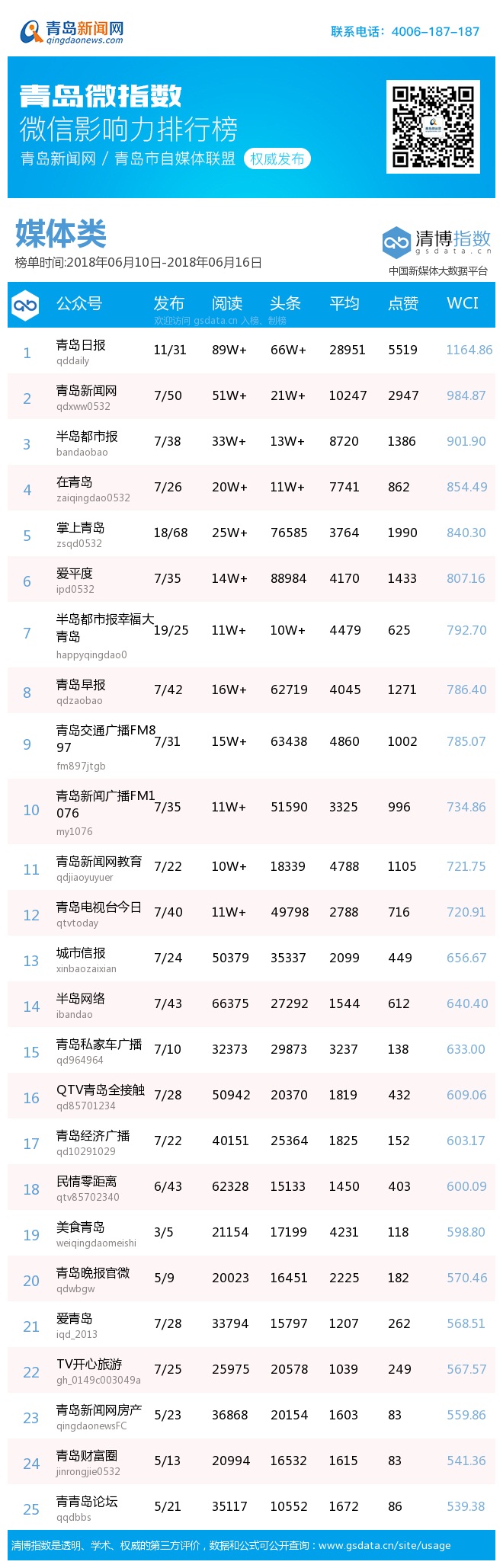 青島新聞網6月20日訊(記者 邢書玲)由青島新聞網、清博指數平臺聯手打造的“青島微指數微信影響力排行榜”今日發(fā)布一周(6.10—6.16)榜單。