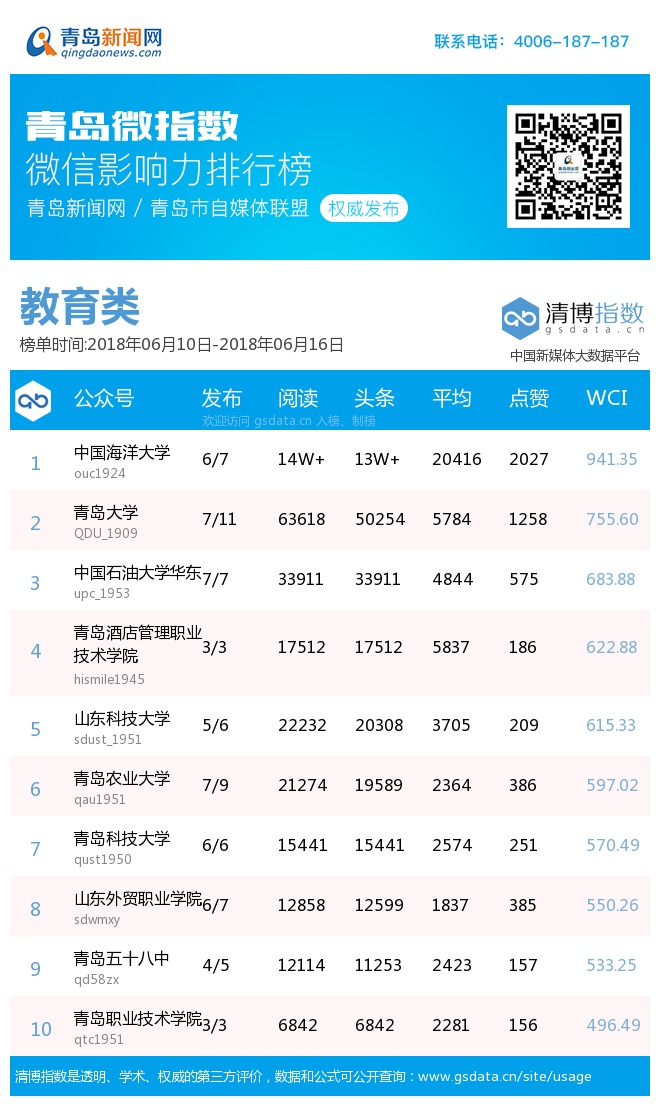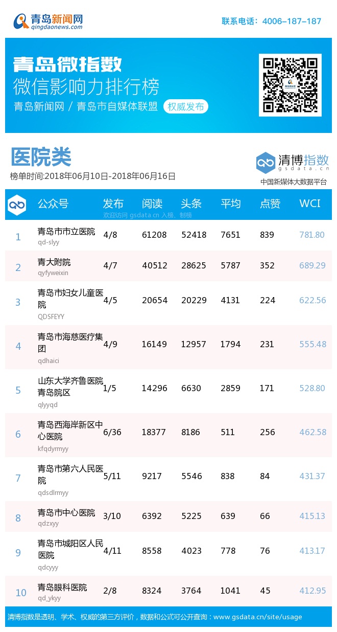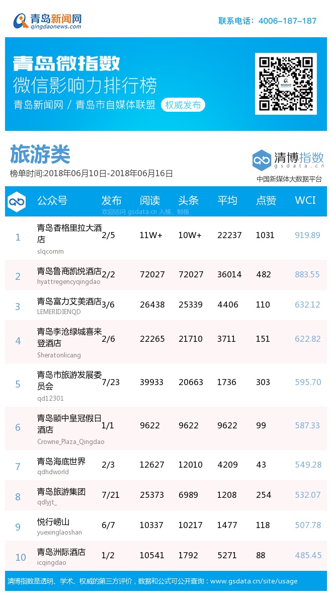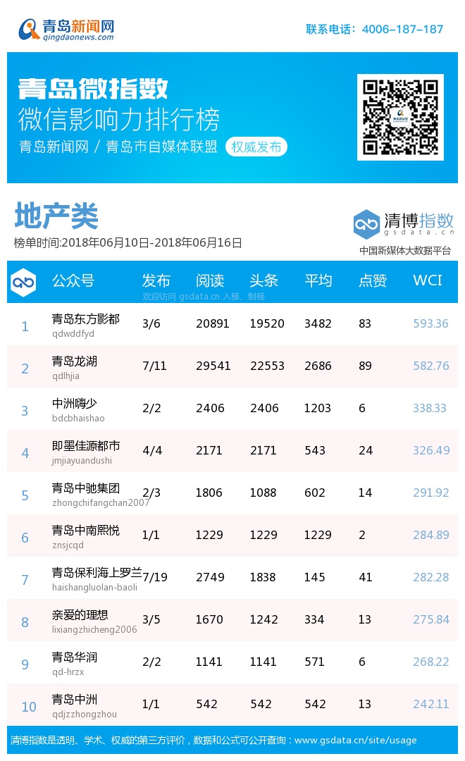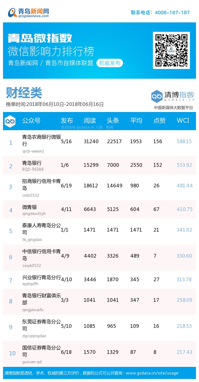 青島新聞網6月20日訊(記者 邢書玲)由青島新聞網、清博指數平臺聯手打造的“青島微指數微信影響力排行榜”今日發(fā)布一周(6.10—6.16)榜單。