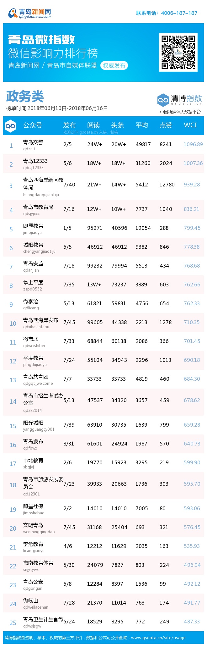 青島微指數微信影響力排行榜(6月10日-6月16日)“青島交警”連奪兩篇10萬+爆文