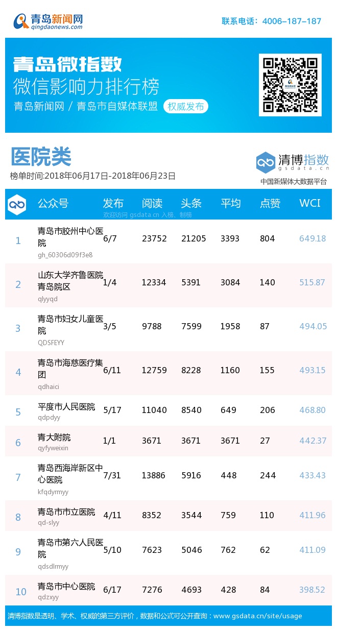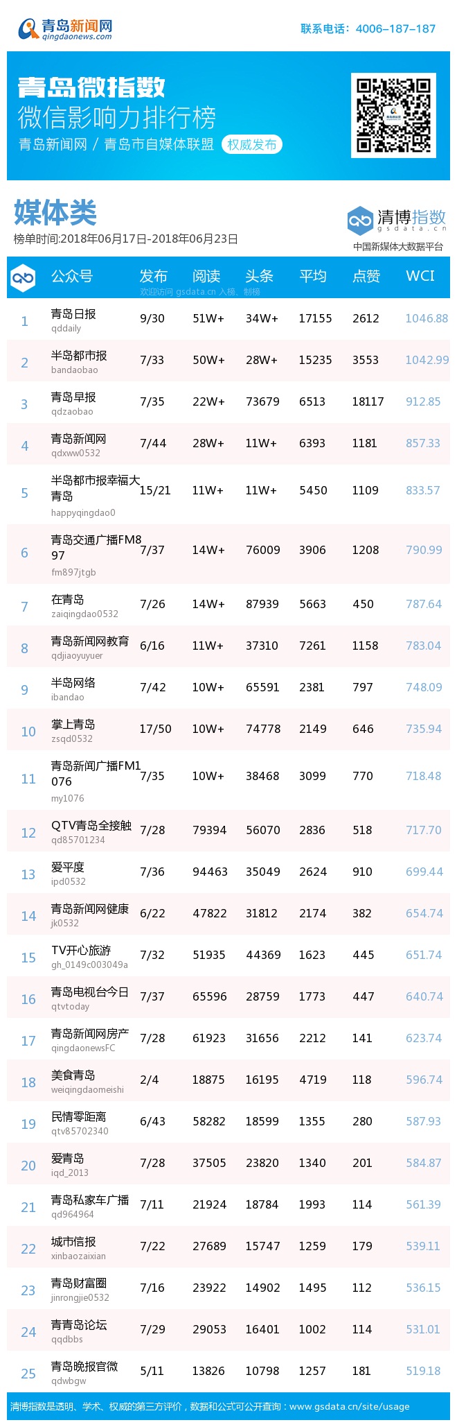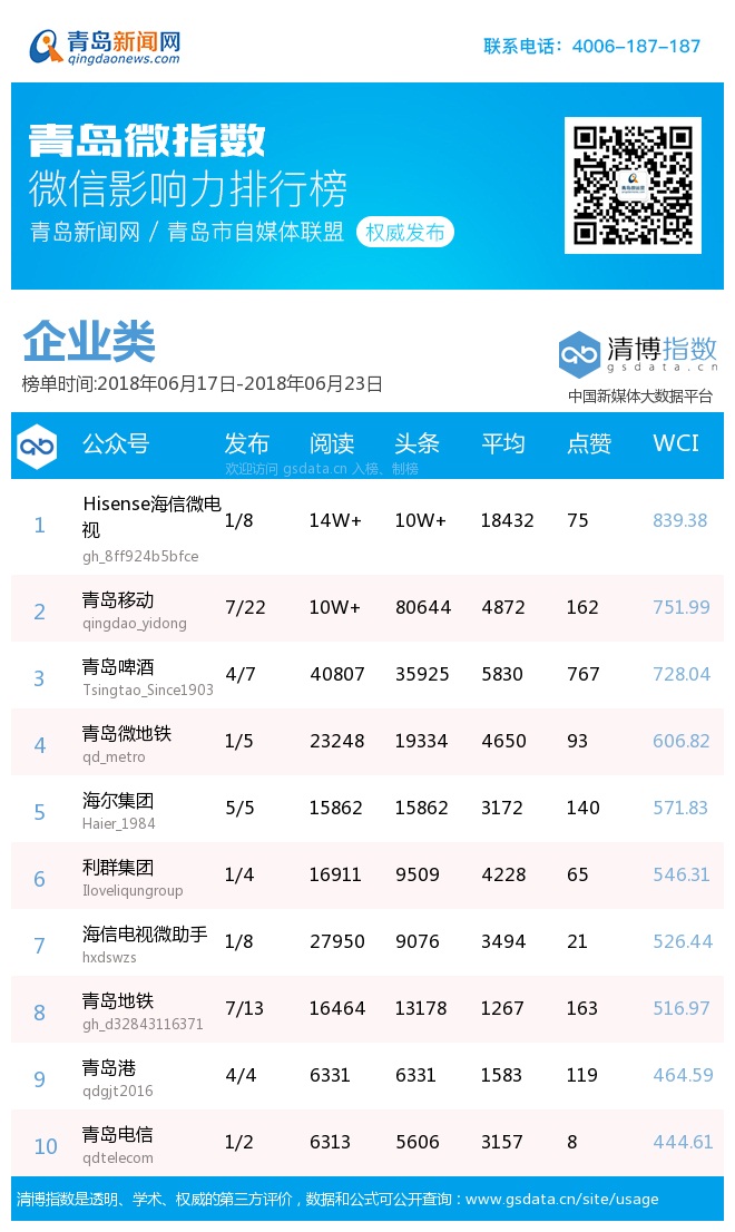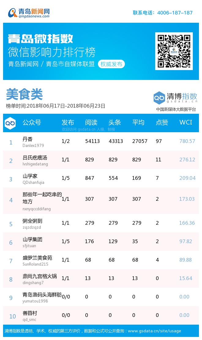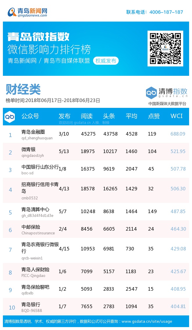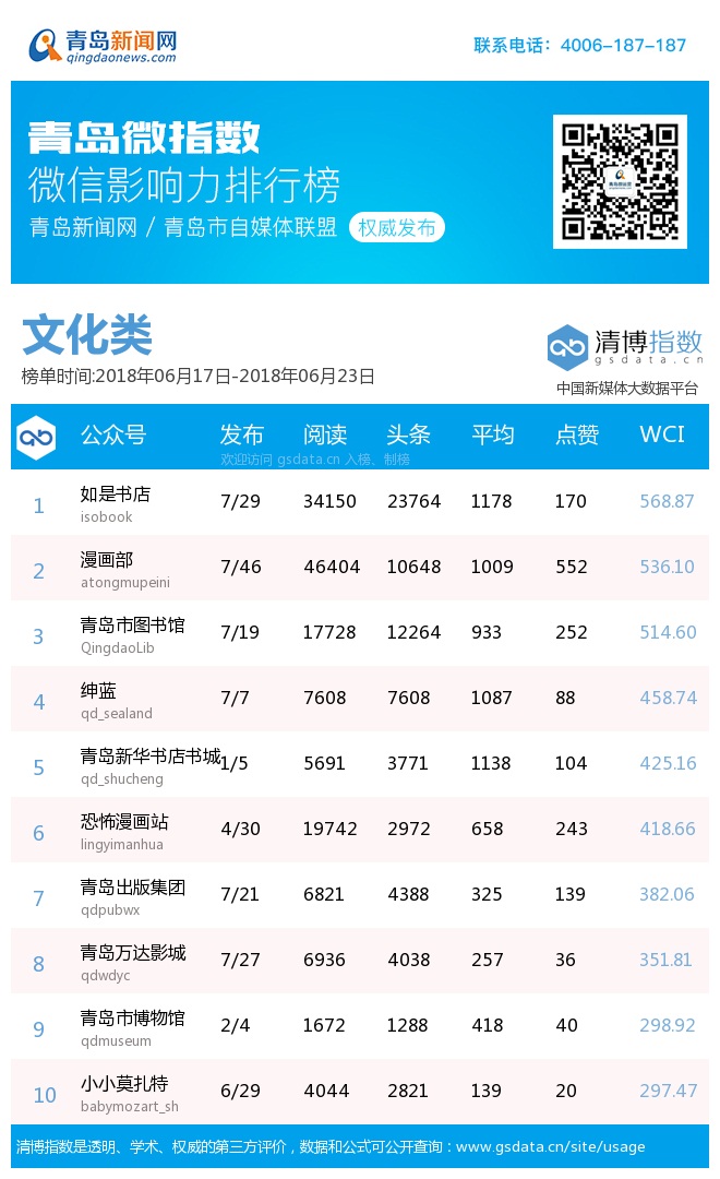 青島新聞網(wǎng)6月25日訊(記者 邢書(shū)玲)由青島新聞網(wǎng)、清博指數(shù)平臺(tái)聯(lián)手打造的“青島微指數(shù)微信影響力排行榜”今日發(fā)布一周(6.17—6.23)榜單。