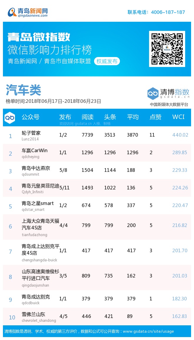 3、本次榜單收錄了青島14個(gè)行業(yè)微信公眾號(hào),如您的賬號(hào)暫未收錄,可聯(lián)系4006-187-187。