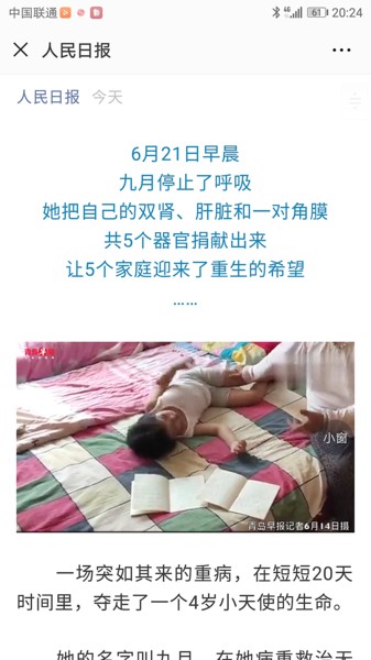 繼前晚新華社官方微信公眾號根據(jù)青島早報記者采寫的內(nèi)容、拍攝的照片視頻,編發(fā)推送了《淚奔!4歲天使離開人間,卻用小小身體拯救了5個家庭……》的文章后,昨天上午8時,人民日報官方微信公眾號也同樣根據(jù)青島早報記者采寫的內(nèi)容、拍攝的照片視頻推送了一條微信,閱讀量很快就突破了10萬,截至昨天下午4時,該條微信僅點贊數(shù)量就達2.8萬次。昨天,共青團山東省委的官方微信公眾號“青春山東”也轉(zhuǎn)載了青島早報的內(nèi)容予以推送。