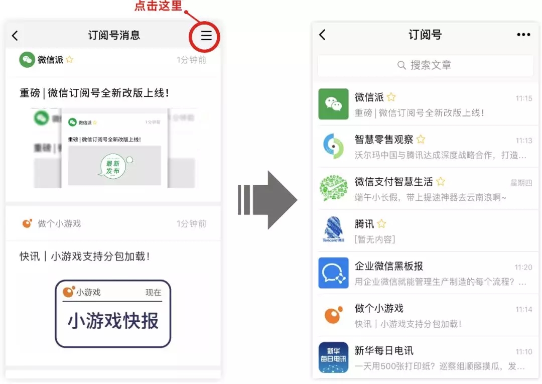 以前進(jìn)入訂閱號(hào)列表,頁(yè)面由”公眾號(hào)名稱(chēng)+標(biāo)題”的純文字形式組成,看文章有2步操作,先點(diǎn)擊標(biāo)題,再通過(guò)公眾號(hào)界面的封面圖進(jìn)入文章。