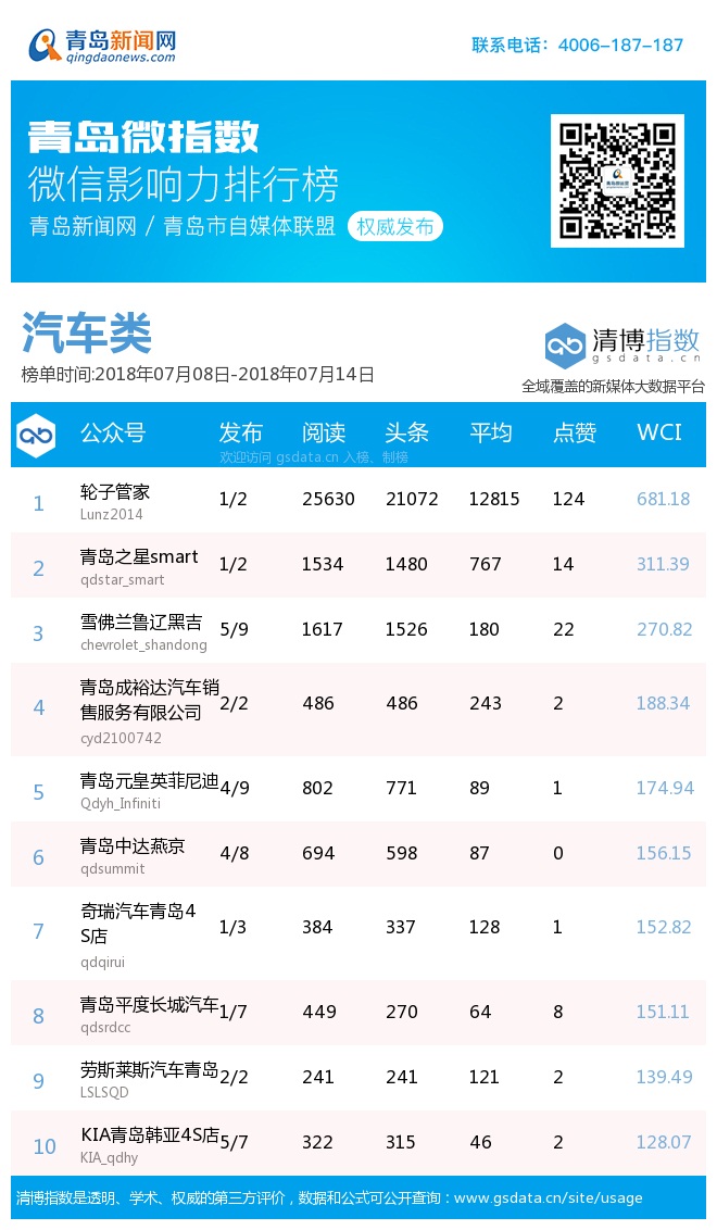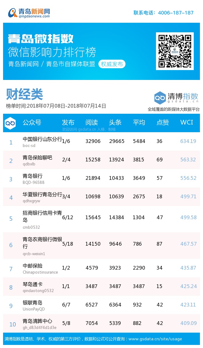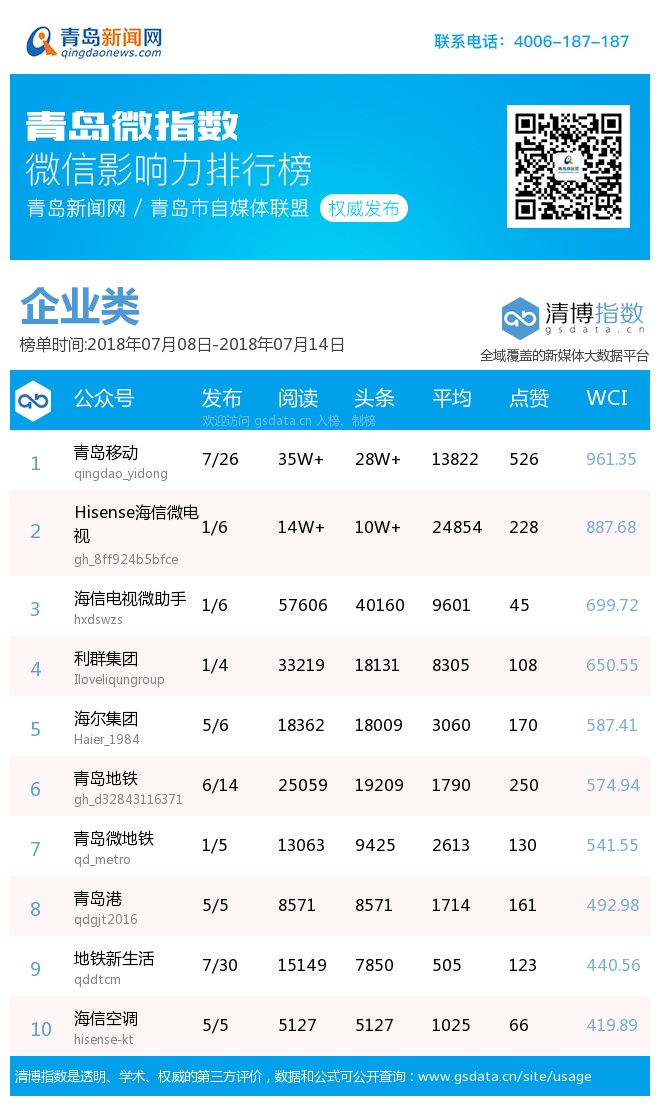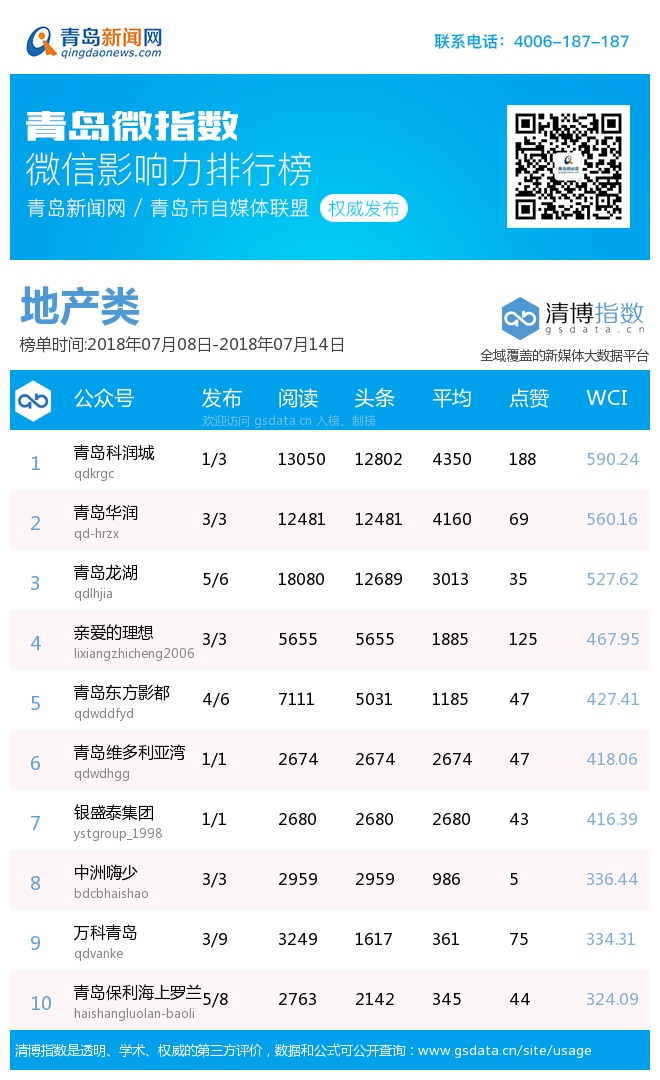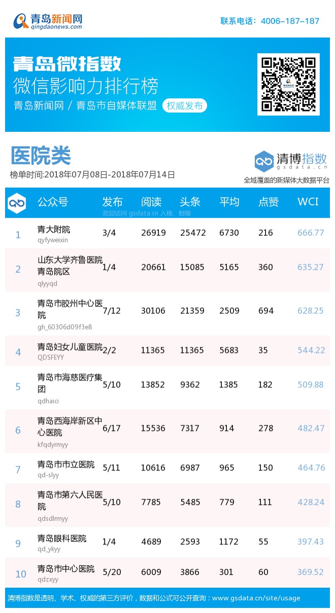 3、本次榜單收錄了青島14個行業(yè)微信公眾號,如您的賬號暫未收錄,可聯(lián)系4006-187-187。