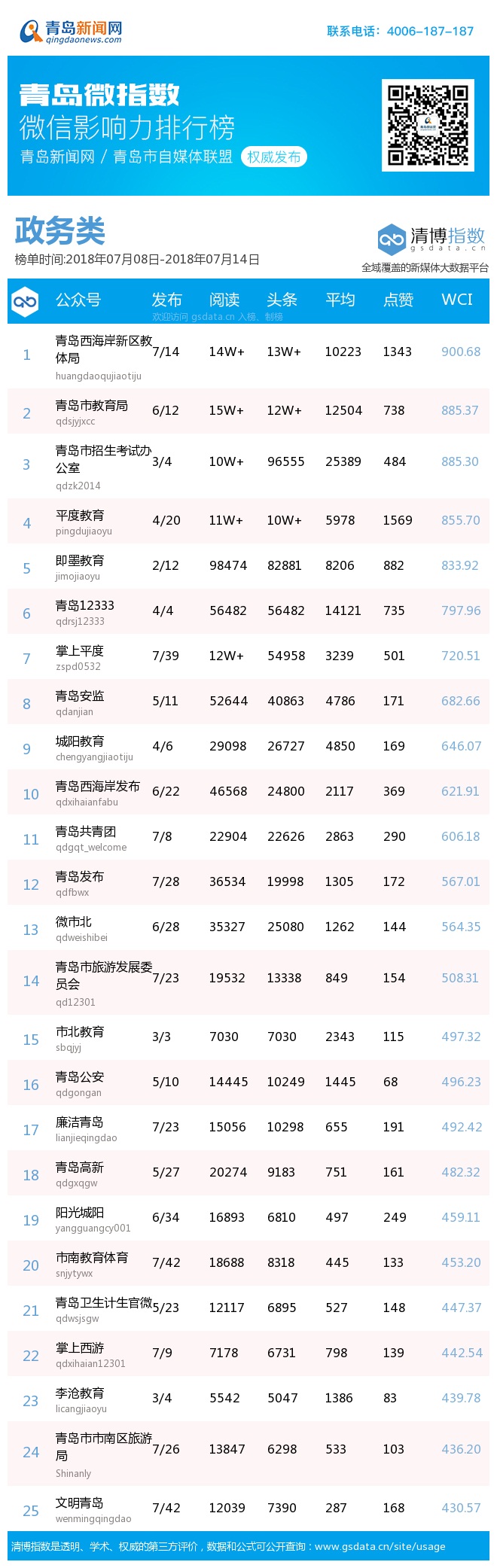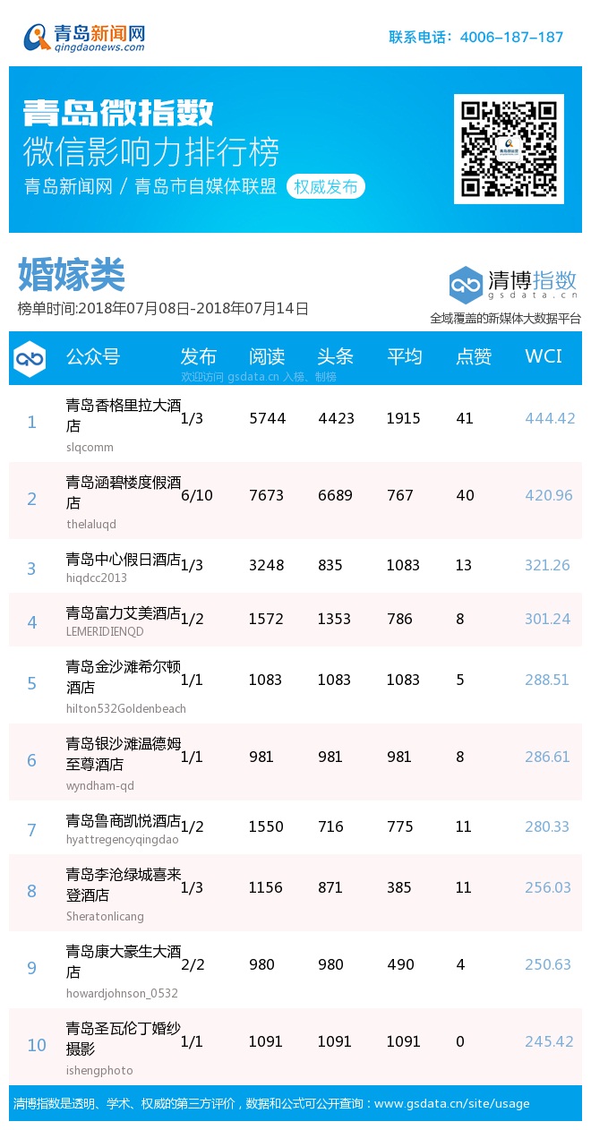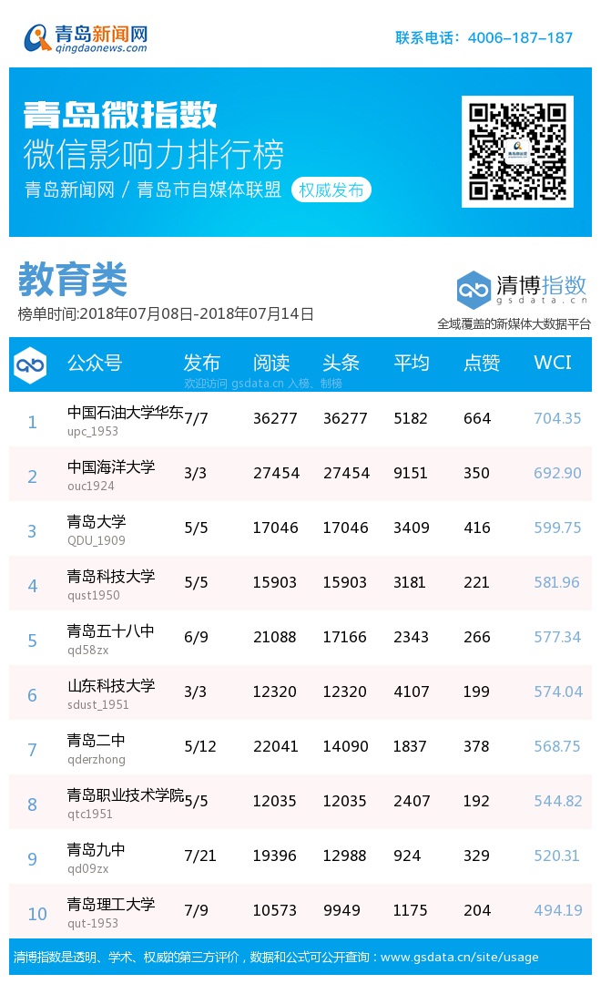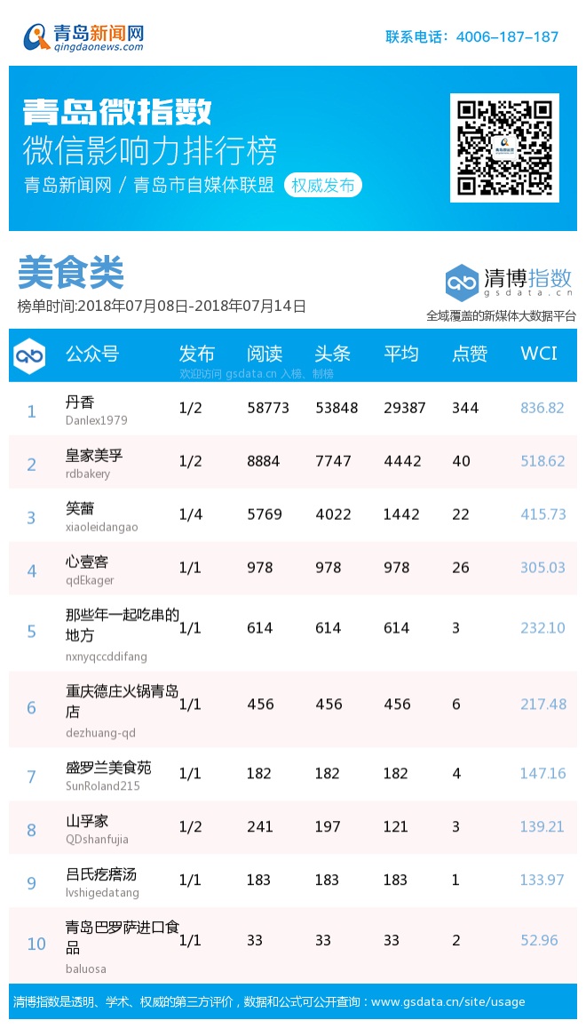 3、本次榜單收錄了青島14個行業(yè)微信公眾號,如您的賬號暫未收錄,可聯(lián)系4006-187-187。