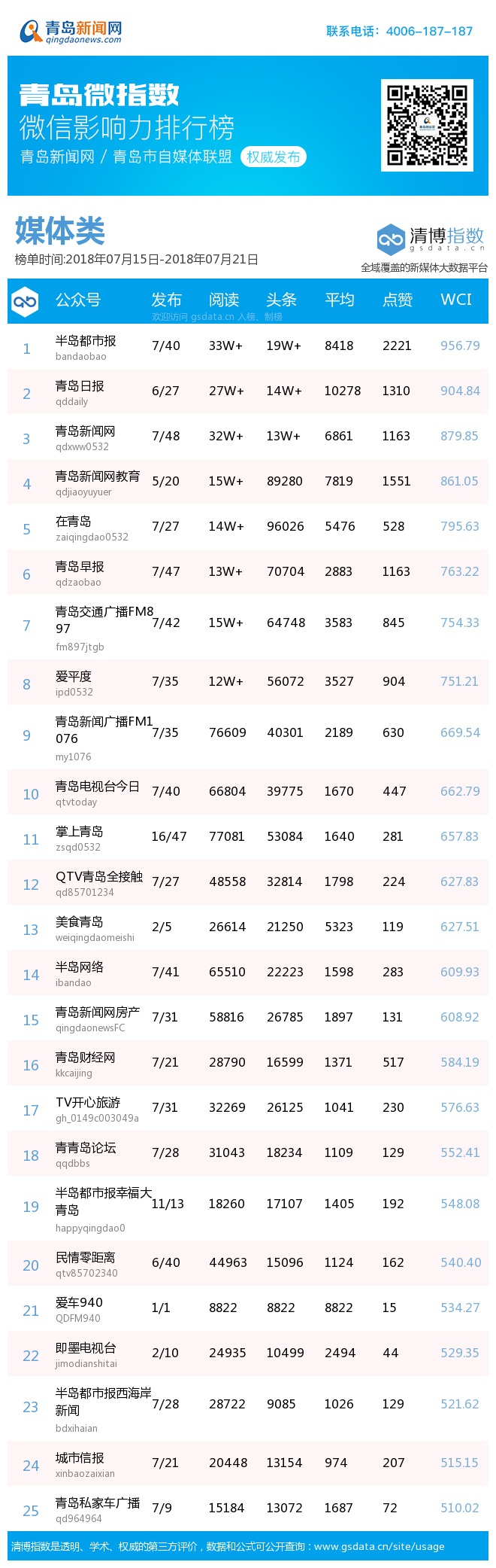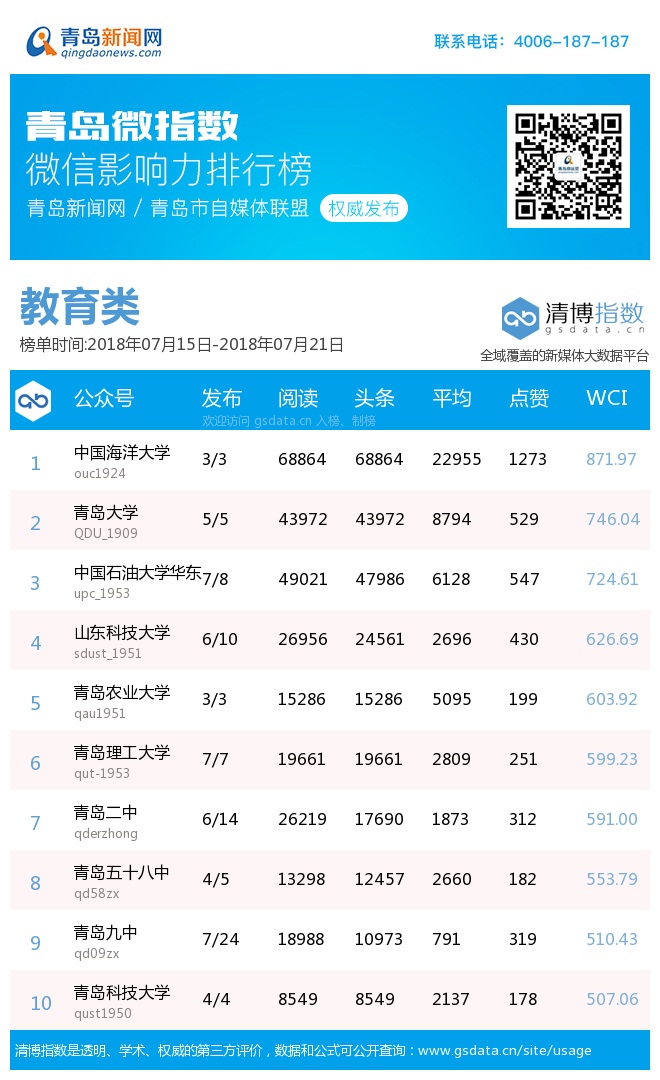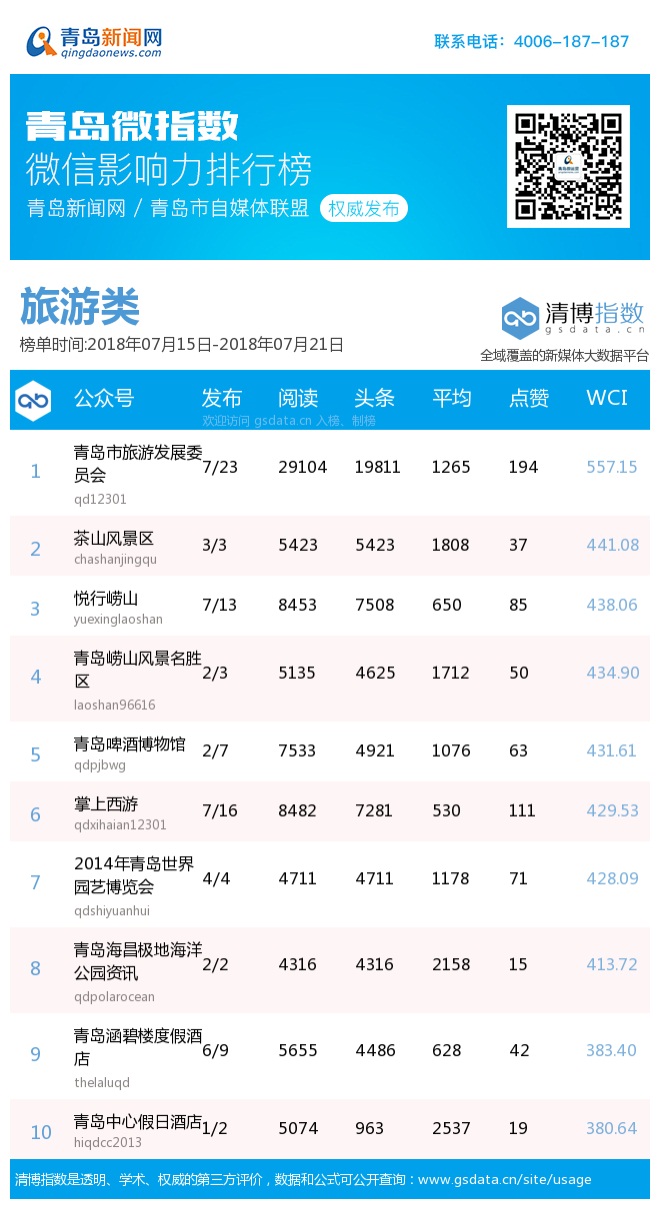 3、本次榜單收錄了青島14個行業(yè)微信公眾號,如您的賬號暫未收錄,可聯(lián)系4006-187-187。