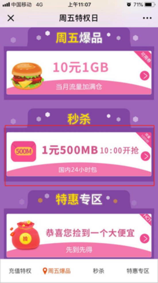 第五步:每周五10:00,還可參與1元搶購500MB24小時(shí)包活動,搶購份數(shù)以當(dāng)前頁面為準(zhǔn),搶完為止。
