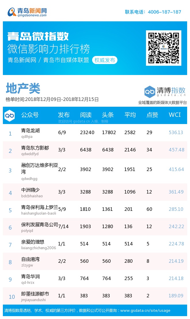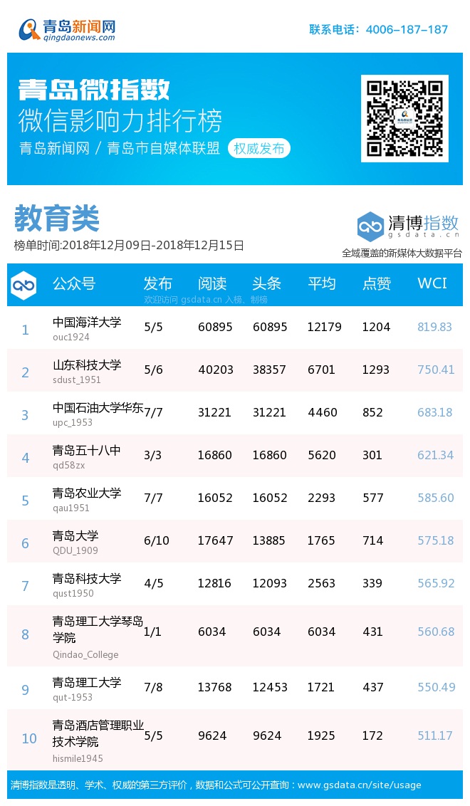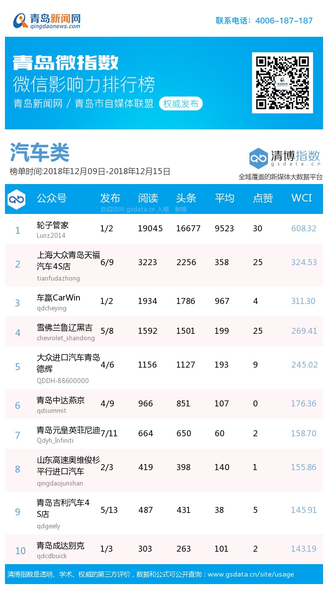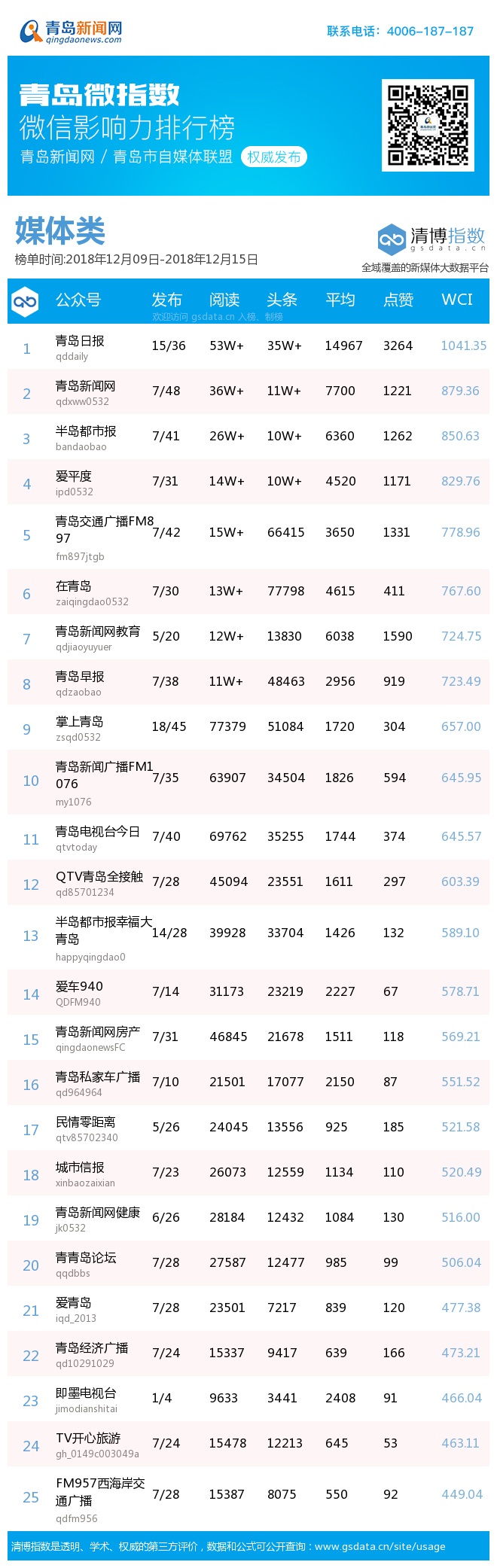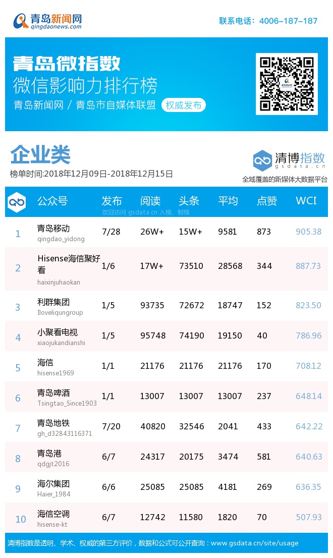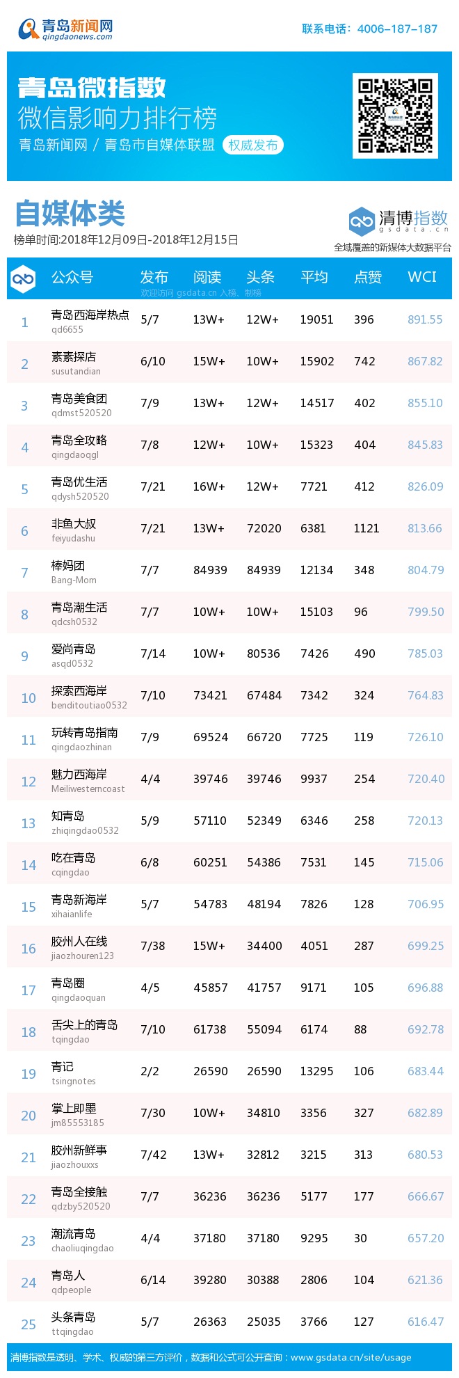 青島新聞網(wǎng)12月17日訊(記者 邢書玲)由青島新聞網(wǎng)、清博指數(shù)平臺(tái)聯(lián)手打造的“青島微指數(shù)微信影響力排行榜”今日發(fā)布一周(12月9日-12月15日)榜單。