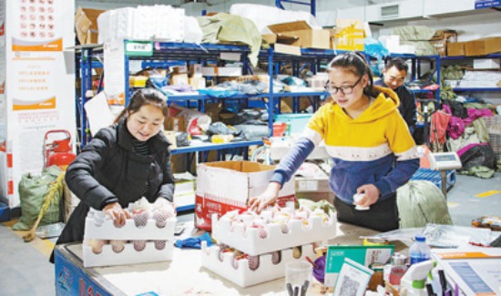在四川阿壩藏族羌族自治州小金縣電子商務(wù)產(chǎn)業(yè)園內(nèi), 工作人員正在為電商平臺(tái)包裝商品。