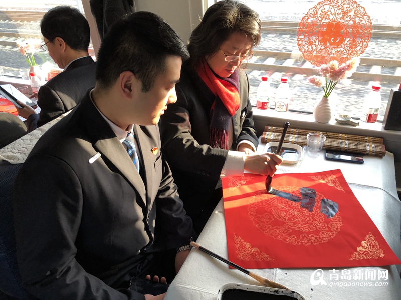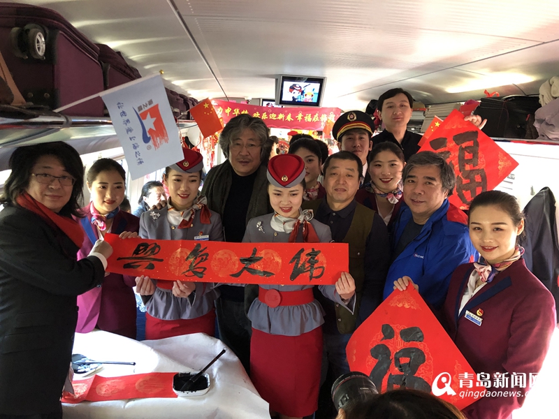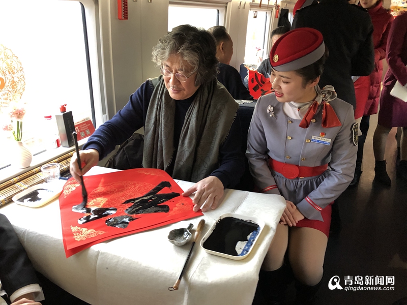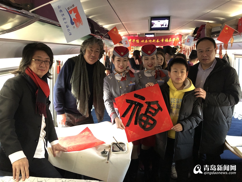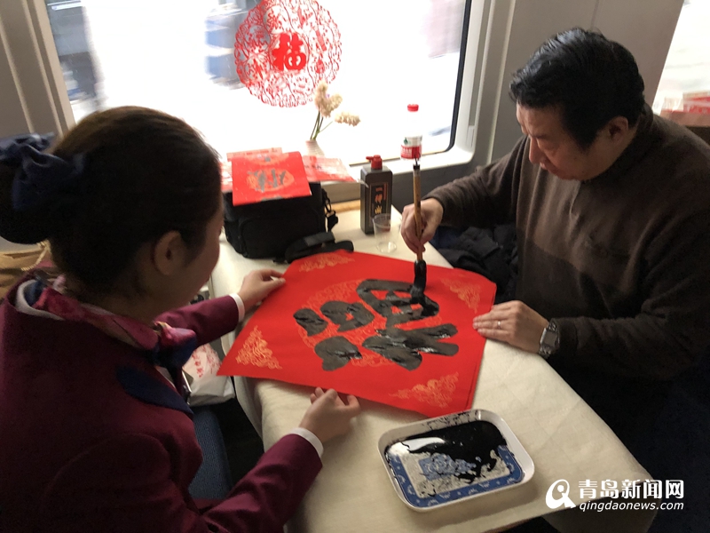 車廂內(nèi),青島市文聯(lián)黨組書記、副主席魏勝吉與范國強(qiáng)、張景、趙善亭、郭強(qiáng)、宋文京、姜樂平、張耀輝、倪漢嬰、王秀泉、蘇萬利等10余位青島書法名家揮毫潑墨,將幅幅寫滿春節(jié)祝福的大紅福字及春聯(lián)送到列車乘務(wù)組人員及返鄉(xiāng)務(wù)工人員手中,為他們送上春節(jié)祝福。對(duì)他們?yōu)榍鄭u城市建設(shè)的付出表達(dá)敬意。