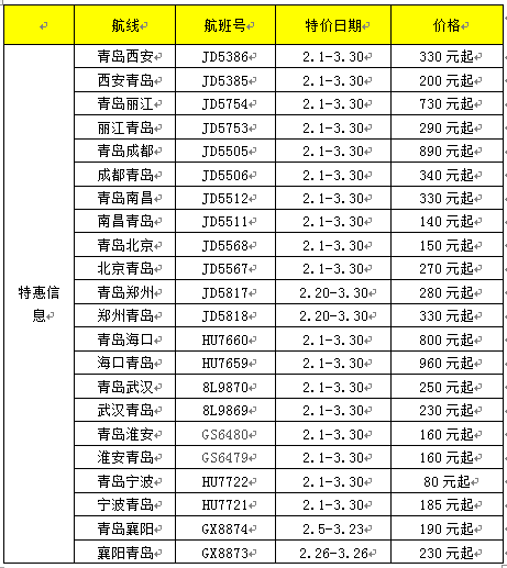 1月29日,從海南航空商委青島營業(yè)部獲悉,為了滿足春運大量旅客的出行需求。海南航空商委聯(lián)合旗下航空公司海南航空、首都航空、天津航空、祥鵬航空、北部灣航空近期在青島=西安、麗江、成都、南昌、海口、北京、武漢、鄭州、淮安、寧波、襄陽等多條航線推出特價機票,部分特價機票為1至3折。