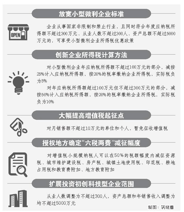 創(chuàng)新企業(yè)所得稅計(jì)算方法,加大企業(yè)所得稅優(yōu)惠力度。此次政策調(diào)整,引入企業(yè)所得稅超額累進(jìn)計(jì)算方法,對小型微利企業(yè)年應(yīng)納稅所得額不超過100萬元的部分,減按25%計(jì)入應(yīng)納稅所得額,按20%的稅率繳納企業(yè)所得稅,實(shí)際稅負(fù)為5%;對年應(yīng)納稅所得額超過100萬元但不超過300萬元的部分,減按50%計(jì)入應(yīng)納稅所得額,按20%的稅率繳納企業(yè)所得稅,實(shí)際稅負(fù)為10%。政策調(diào)整后,小微企業(yè)企業(yè)所得稅整體稅負(fù)降幅在50%以上,優(yōu)惠力度不斷加碼。