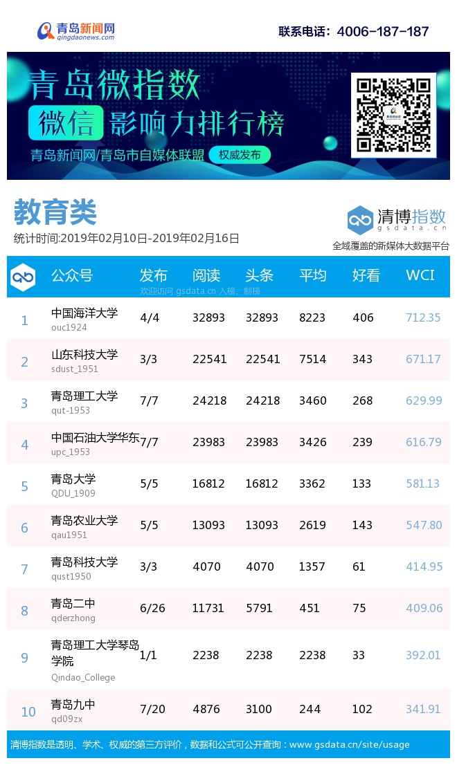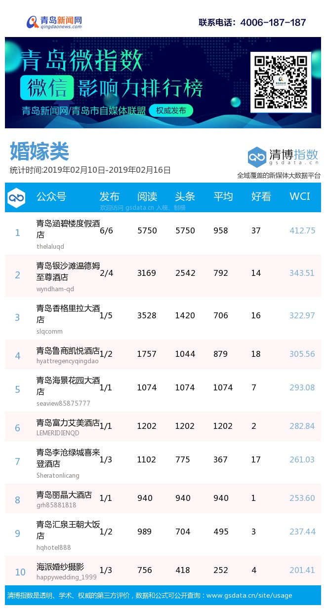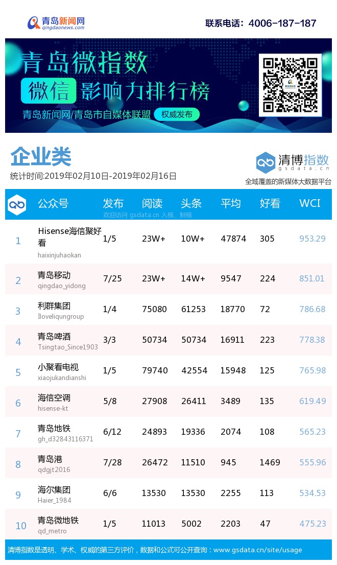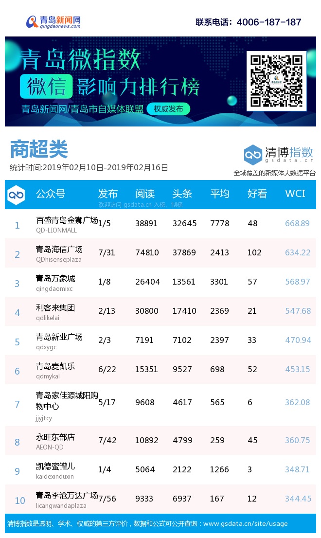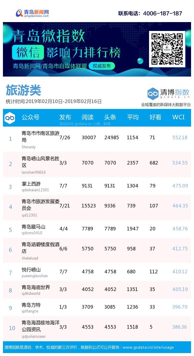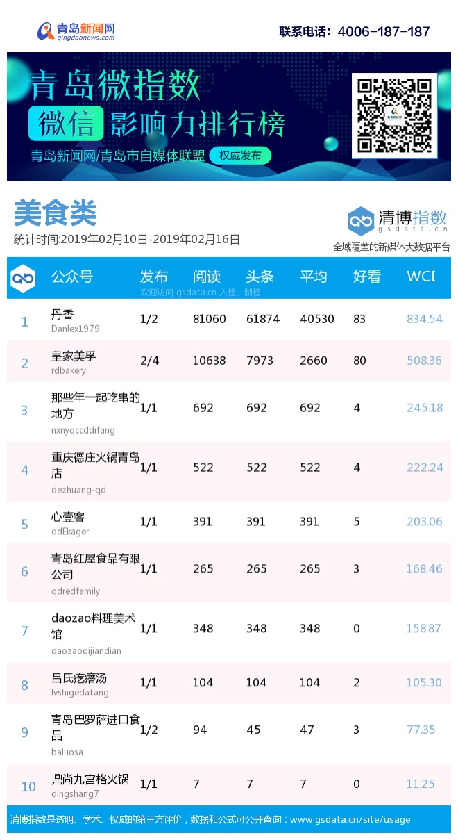 3、本次榜單收錄了青島14個行業(yè)微信公眾號,如您的賬號暫未收錄,可聯系4006-187-187。