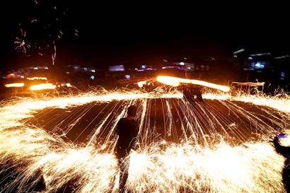 2月19日農(nóng)歷正月十五,這天晚上,不少人的朋友圈被一種新奇的表演刷屏:畫面中四五個(gè)人聚成一堆一起轉(zhuǎn)動(dòng)一根長(zhǎng)桿,一個(gè)火球在漆黑的夜空中跟隨長(zhǎng)桿甩動(dòng),火球所到之處飛濺出絢爛的火花,火花相連形成一道華麗的軌跡。周圍觀眾此起彼伏的歡呼和驚嘆聲不絕于耳。這項(xiàng)表演就是拎淋花。拎淋花簡(jiǎn)單來說,就是把碎鐵片燃燒至即將熔化的狀態(tài),然后讓其從放置在較高處的鐵籠子中旋轉(zhuǎn)灑落,在夜空中形成一圈圈飛濺的火花。絢麗的拎淋花背后是對(duì)每一個(gè)細(xì)節(jié)的嚴(yán)格考究,鐵片的選材、擺放都十分有講究。火花產(chǎn)生的關(guān)鍵是旋轉(zhuǎn),盛有鐵粉和煤炭的鐵籠重四十多斤,至少4個(gè)壯年人才能轉(zhuǎn)得動(dòng)。表演通常持續(xù)一個(gè)小時(shí),對(duì)表演者的體力提出了巨大的考驗(yàn),因此場(chǎng)下還有準(zhǔn)備隨時(shí)替換的人。