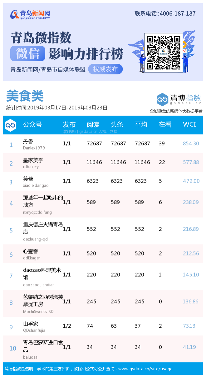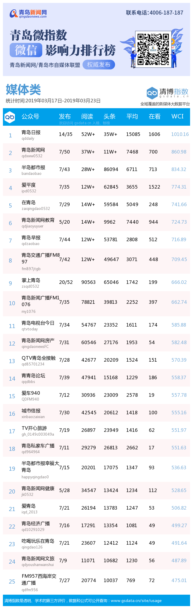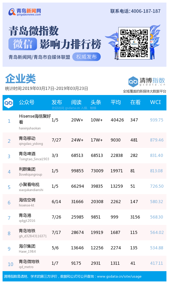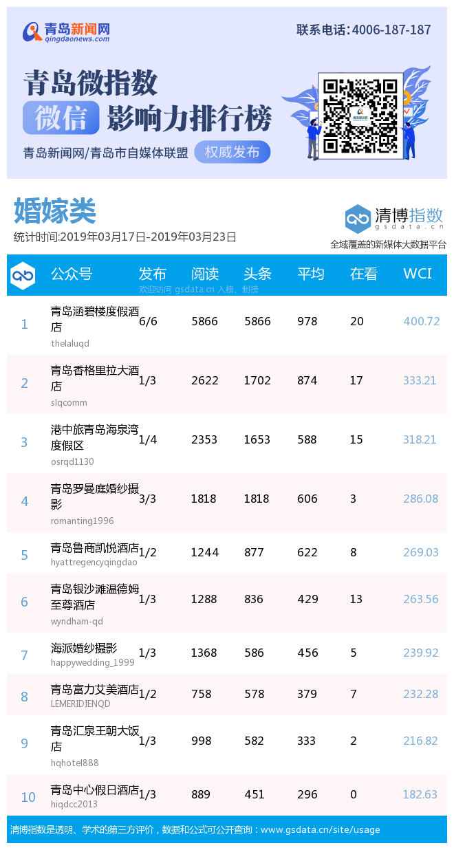 3、本次榜單收錄了青島14個行業(yè)微信公眾號,如您的賬號暫未收錄,可聯(lián)系4006-187-187。