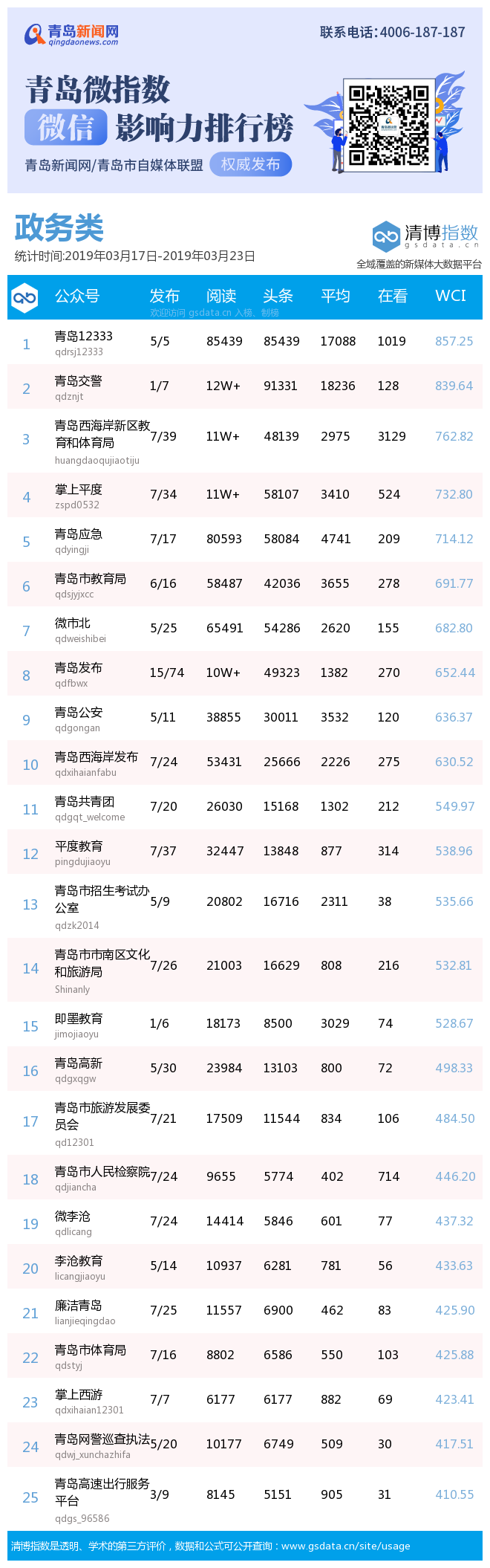 青島新聞網(wǎng)3月25日訊(記者 邢書玲)由青島新聞網(wǎng)、清博指數(shù)平臺聯(lián)手打造的“青島微指數(shù)微信影響力排行榜”今日發(fā)布一周(3月17日-3月23日)榜單。